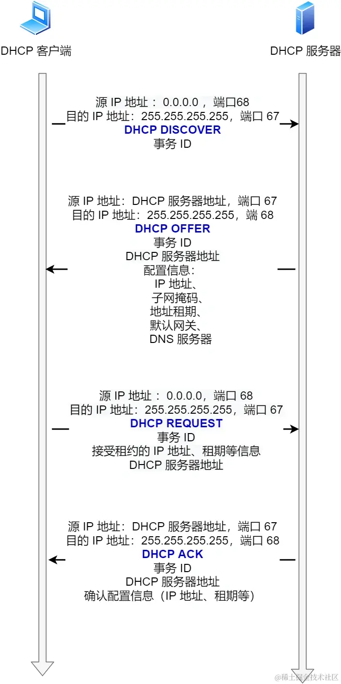 - 最后,服务端用 DHCP ACK 报文对 DHCP 请求报文进行响应,应答所要求的参数。