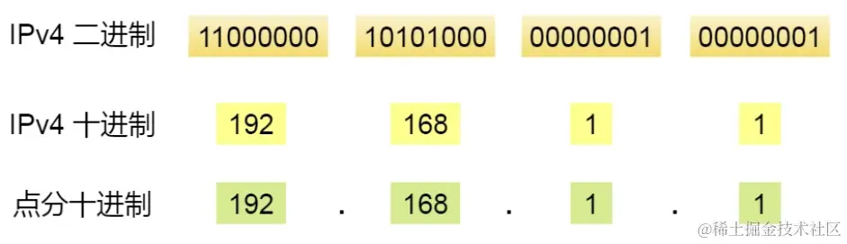 而人类为了方便记忆采用了点分十进制的标记方式,也就是将 32 位 IP 地址以每 8 位为组,共分为 4 组,每组以「.」隔开,再将每组转换成十进制。