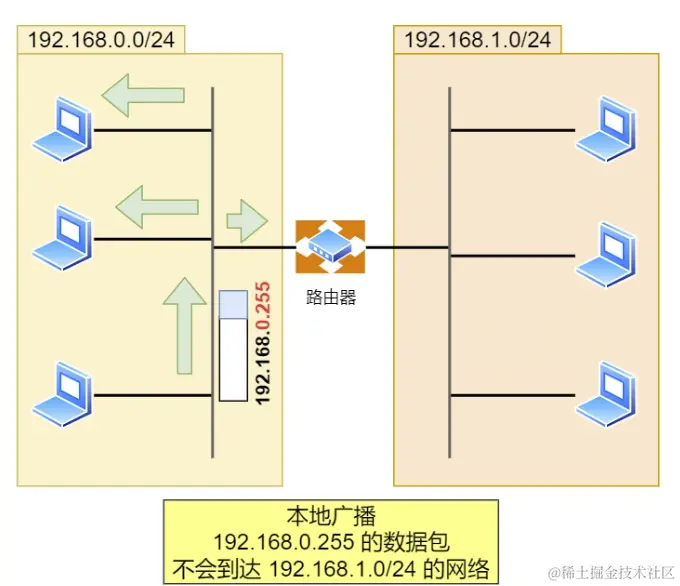 - 在本网络内广播的叫做本地广播。例如网络地址为 192.168.0.0/24 的情况下,广播地址是 192.168.0.255 。因为这个广播地址的 IP 包会被路由器屏蔽,所以不会到达 192.168.0.0/24 以外的其他链路上。