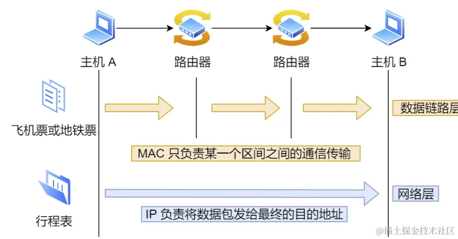 在区间内移动相当于数据链路层,充当区间内两个节点传输的功能,区间内的出发点好比源 MAC 地址,目标地点好比目的 MAC 地址。