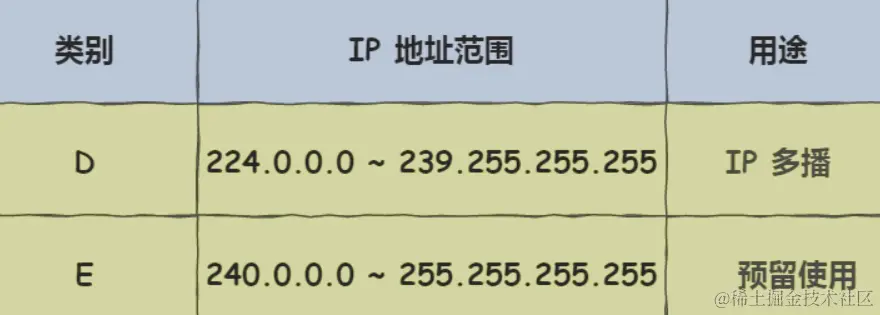 而 D 类和 E 类地址是没有主机号的,所以不可用于主机 IP,D 类常被用于多播,E 类是预留的分类,暂时未使用。