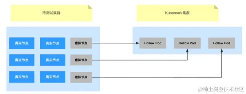 kubemark 是一款针对 k8s 的性能测试工具,它能够使用少量的资源模拟出一个大规模 K8S 集群。为了演示这个工具需要一个待测试的 K8S 集群 A 以及一个装载 Kubemark 服务的 K8S 集群 B(也称 Kubemark 集群),当然也可以使用同一个集群装载 Kubemark,只不过在实践过程中我们习惯将待测试集群和 Kubemark 集群区别开来。这时在 B 集群中部署 Kubemark 的 Hollow Pod,这些 Pod 会主动向 A 集群注册并成为该 K8S 集群中的虚拟节点。也就是说在 B 集群中启动的 Hollow Pod 模拟了 K8S 的 kubelet 和 kube-proxy 并与 A 集群的 API Server 进行交互,让 A 集群误以为这些 Hollow Pod 是真实的节点。这些虚拟节点会完全模拟真实节点的行为,比如它会定时向 API Server 上报节点和 Pod 的状态,也会在用户发起创建 Pod 的请求时进行响应,只不过它不会真的去启动容器而已。也就是说虚拟节点除了不会真的启动容器外,其他的大部分功能都与真实节点差不多。这样设计的目的是为了能够模拟真实的节点对 API Server 等组件造成的压力。这样测试人员就可以避免耗费巨额的成本去搭建真实的集群就可以评估 K8S 的性能了。我们可以认为 kubemark 就像是一个复杂的 mock 服务一样,不必启动容器,但可模拟 kubelet 的行为。 如图: