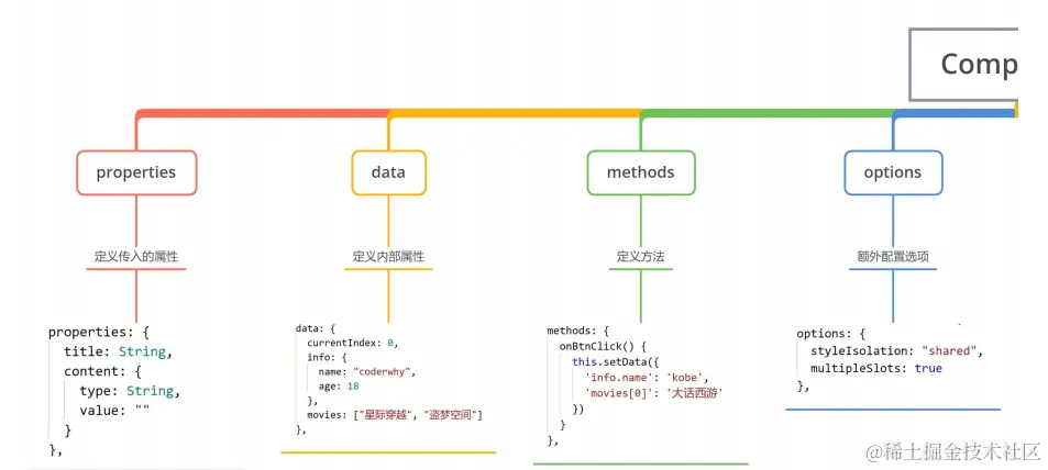 · 向组件传递数据可以通过 properties 属性,支持String、Number、Boolean、Object、Array、null等类型