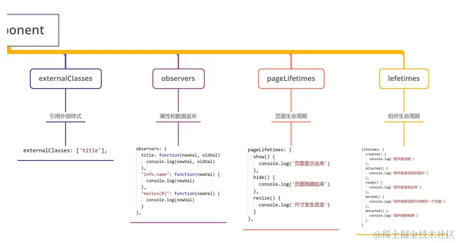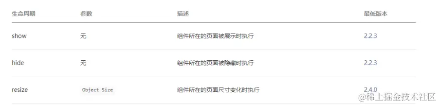 ◼ 自小程序基础库版本 2.2.3 起,组件的的生命周期也可以在 lifetimes 字段内进行声明(这是推荐的方式,其优先级最高)。