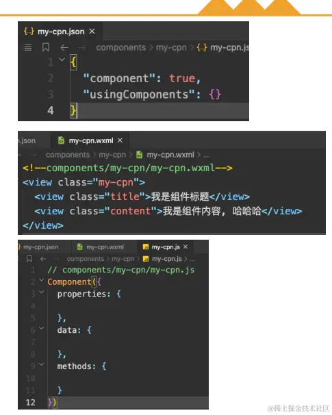 ◼ 类似于页面,自定义组件由 json wxml wxss js 4个文件组成。