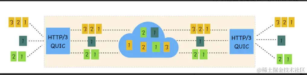HTTP/3基于UDP协议实现了类似于TCP的多路复用数据流、传输可靠性等功能,这套功能被称为QUIC协议