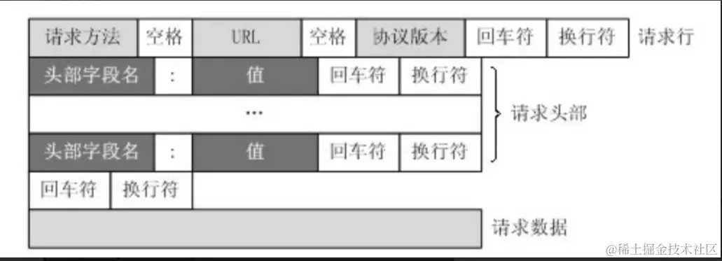 (1)请求⾏包括:请求⽅法字段、URL字段、HTTP协议版本字段。它们⽤空格分隔。例如,GET /index.html HTTP/1.1。