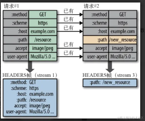 例如下图中的两个请求, 请求一发送了所有的头部字段,第二个请求则只需要发送差异数据,这样可以减少冗余数据,降低开销。