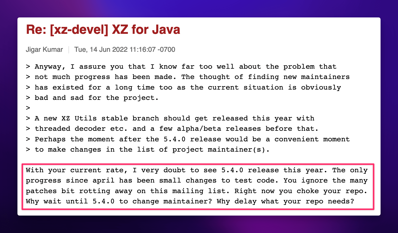 然而,悲剧的一幕出现了。Jia Tan 在掌控项目后不久,竟然在代码中植入了一个严重的安全漏洞!这一切,原来都是精心策划的阴谋。而那些不断对 Lasse 施压的 “索取党”,无疑也要背负一定的责任。