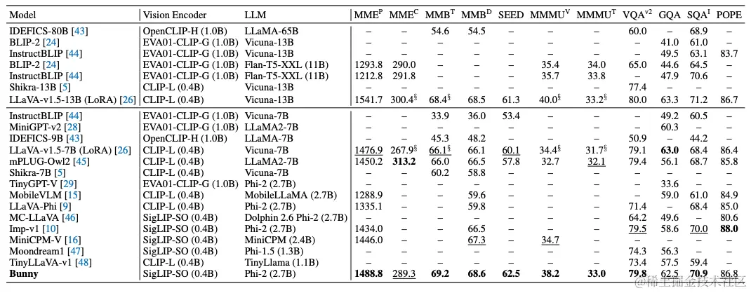 Bunny,这是一系列基于数据优化的轻量级多模态模型。Bunny提供了灵活的视觉编码器和语言模型组合,通过从更丰富的训练数据中学习,实现了性能超越大型MLLM的效果。特别地,Bunny-3B模型在多个基准测试中,不仅优于同等规模的MLLM,还超过了规模更大(13B)的SOTA模型。
