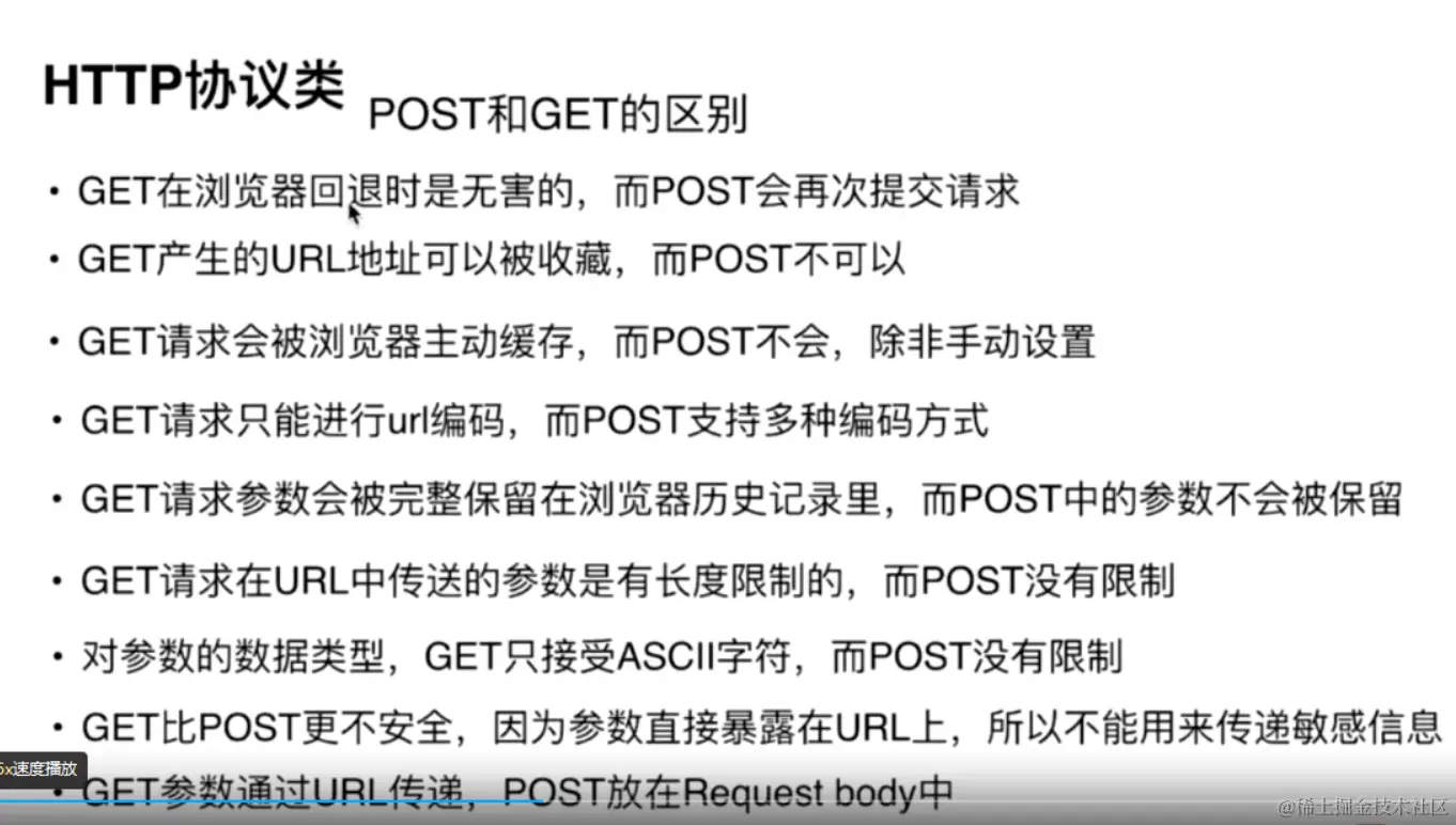 http协议类 post和get的区别 get在浏览器回退时是无害的,而post会再次提交请求 get产生的url地址可以被收藏,而post不可以 ,get请求会被浏览器主动缓存,而post不会,除非手动设置 get请求只能进行url编码,而post支持多种编码方式 get请求参数会被完整保留在浏览器历史记录里,而post中的参数不会被保留 get请求在url中传送的参数是有长度限制的,而post没有限制 对参数的数据类型,get只接受ascii字符,而post没有限制 get比post更不安全,因为参数直接暴露在url上,所以不能用来传递敏感信息 x速度播放 get参数通过url传递,post放在requestbody中