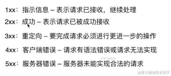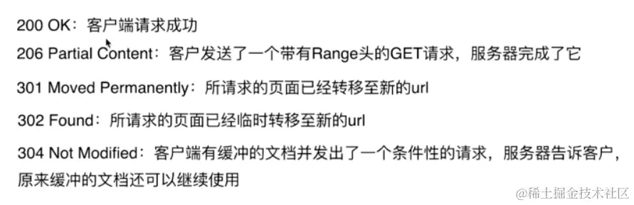 1xx:指示信息-表示请求已接收,继续处理 2xx: :成功-表示请求已被成功接收 3xx:重定向-要完成请求必须进行更进一步的操作 4xx:客户端错误-请求有语法错误或请求无法实现 5xx:服务器错误-服务器未能实现合法的请求 200 ok:客户端请求成功 206 partial content:客户发送了一个带有ranget请求,服务器完成了它 301 moved permantly:所请求的页面已经转移至新的url 302 found:所请求的页面已经临时转移至新的url 304notmodified:客户端有缓冲的文档并发出了一个条件性的请求,服务器告诉客户, 原来缓冲的文档还可以继续使用 200 ok客户端请求成功