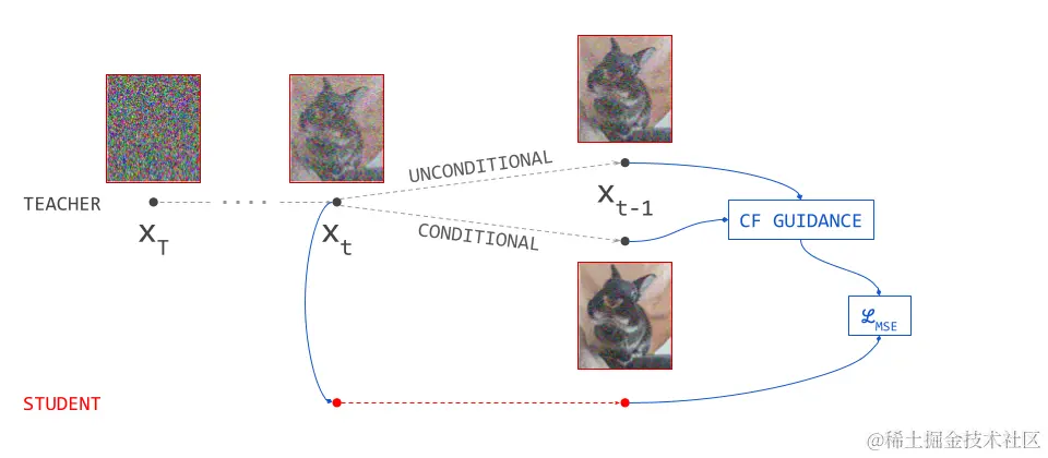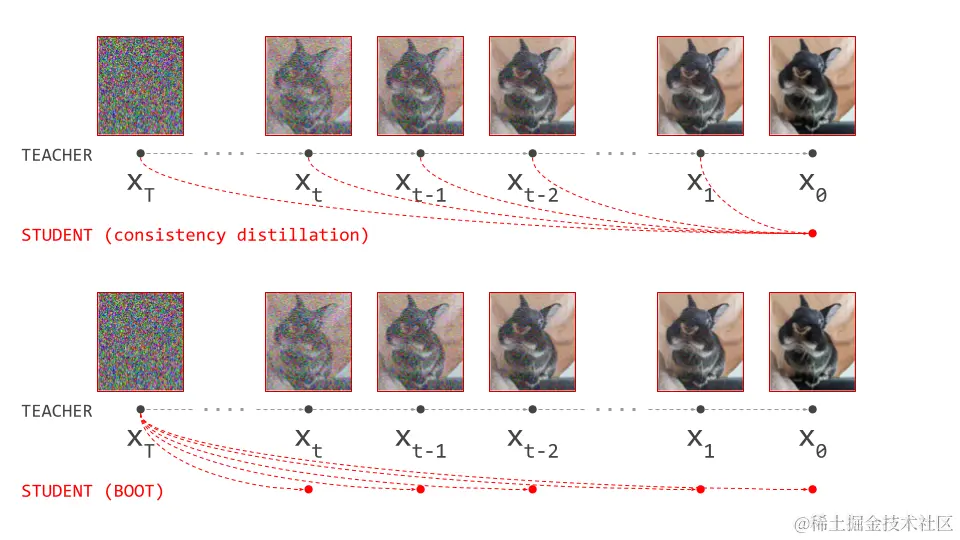 广义上讲,在神经网络的背景下,蒸馏指的是训练一个神经网络模仿另一个神经网络的输出。前者被称为学生模型,后者是教师模型。通常,教师模型已经被训练过,并且其权重被冻结。当应用于扩散模型时,会发生一些有趣的事情:即使学生和教师网络在架构上完全相同,学生的收敛速度也会显著快于教师模型的训练过程。