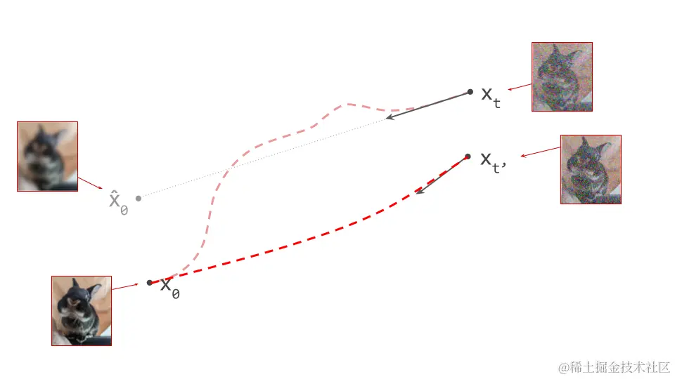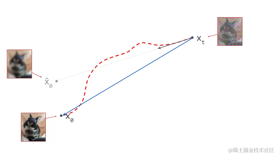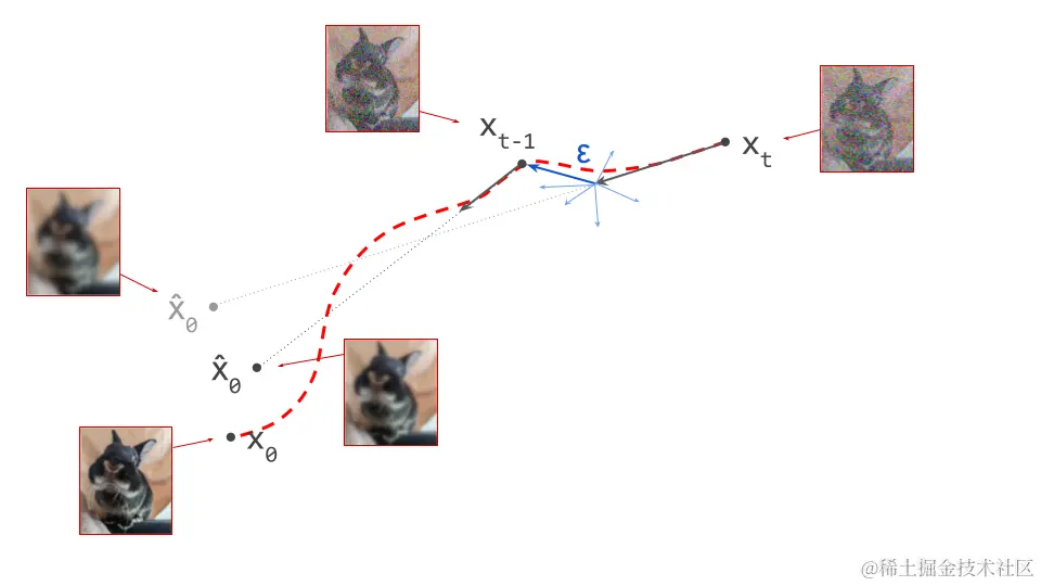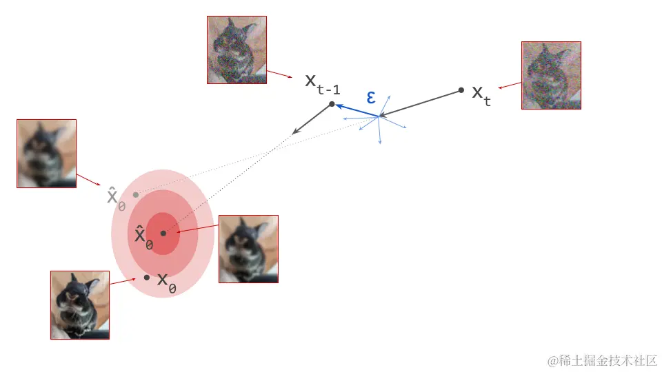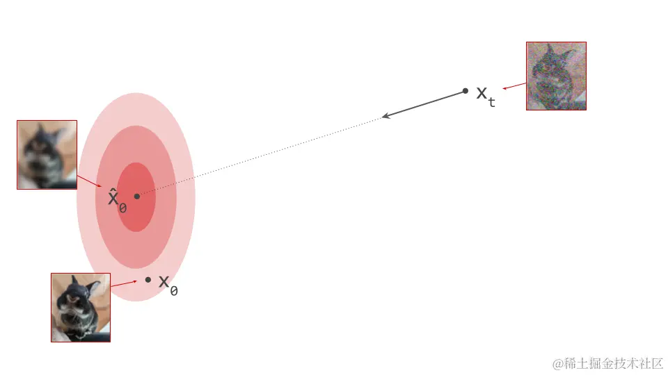 如果我们按照这个方向迈出一步并添加一些噪声(例如在DDPM1采样算法中所做的那样),我们最终得到( \mathbf{x}_{t-1} ),对应于一个略微减少噪声的输入图像。现在预测的方向指向一个更小的、“更具体”的高可能性区域,因为之前的采样步骤解决了一些不确定性。下面的图表显示了这一点。