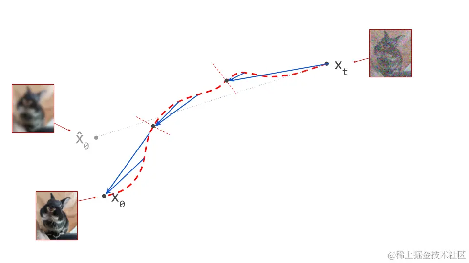 图表展示了我们可能通过输入空间与无限多的采样步骤追踪的曲线的风格化版本(虚线红色曲线)。