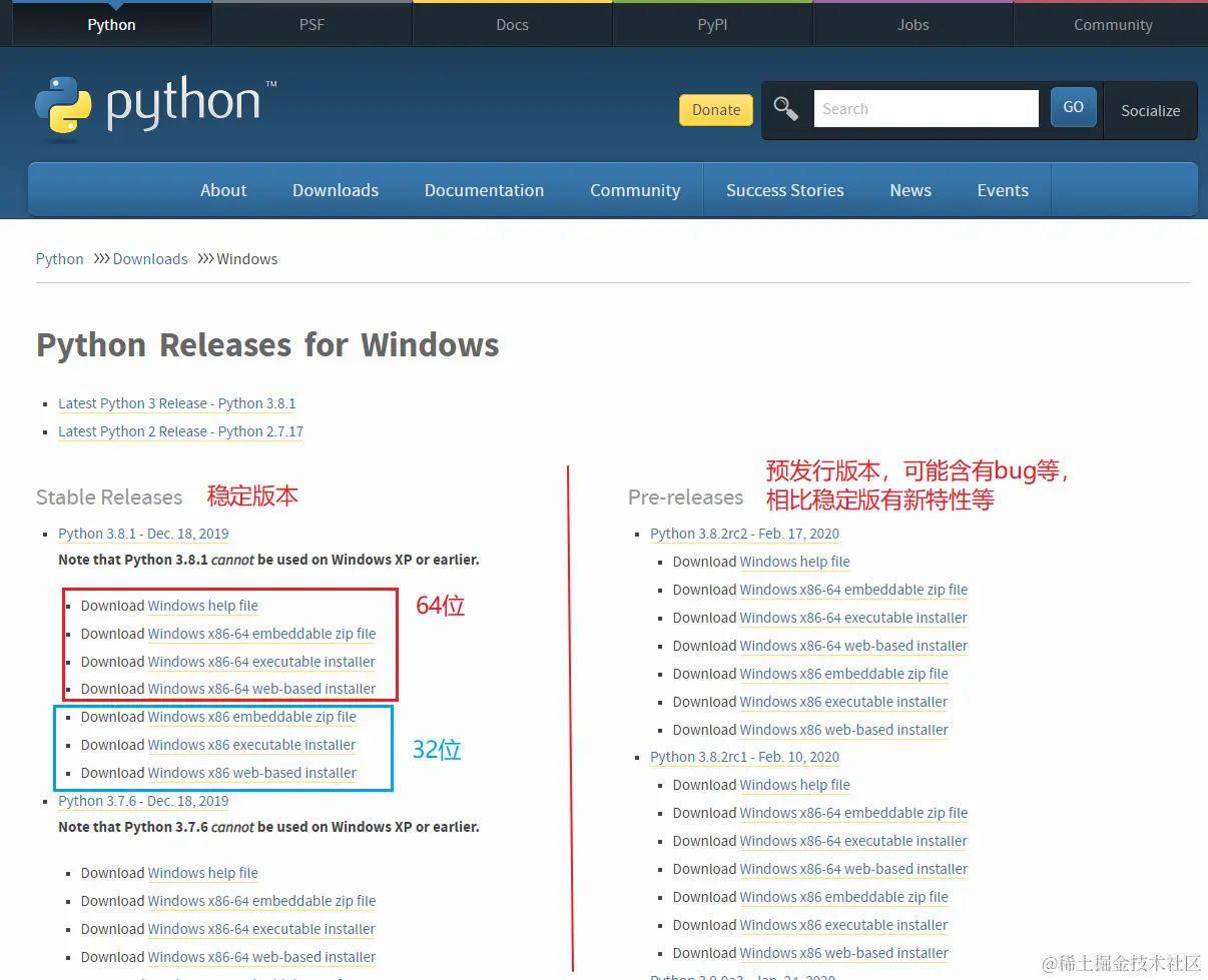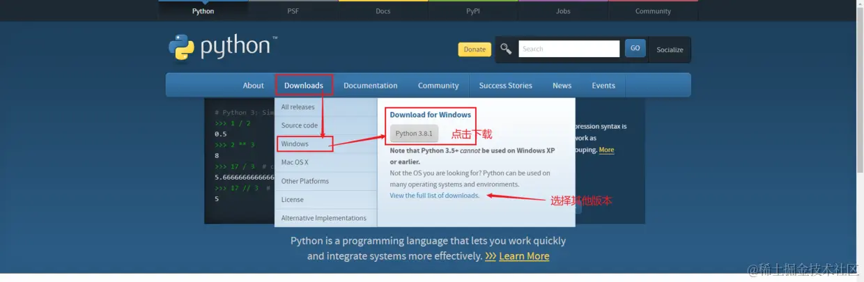 如何下载其他历史版本以及64位版本 点击官网首页的download->Windows进去Windows专区,里面有很多历史版本