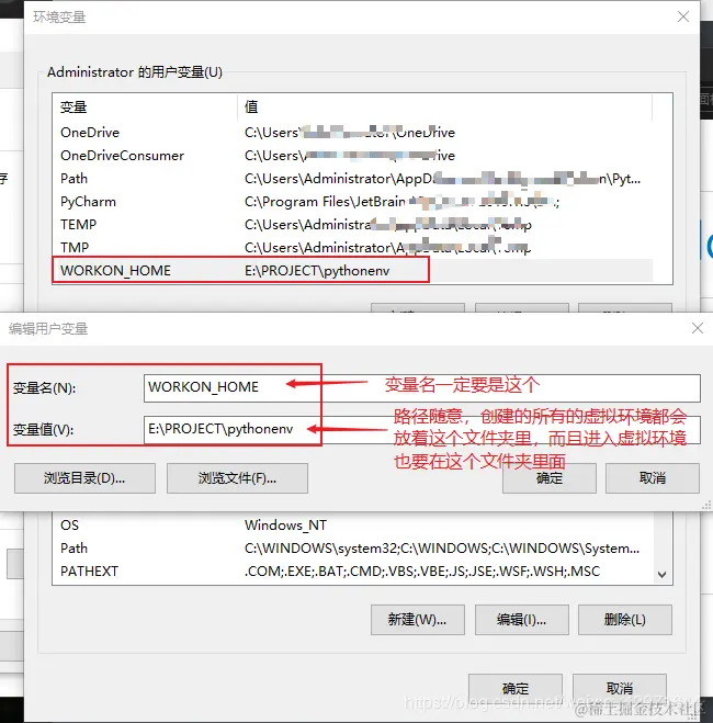 这里需要注意的一点就是:环境变量需要新建一个,环境变量的路径随意,容易知道在哪就好,因为创建的虚拟环境都会放在这个文件夹地下,而且进入虚拟环境需要在当前文件夹里面(这个后面会细说)(这里的说法有点问题,其实不完全需要在环境的文件夹里,用cmd可以在任何地方进入python的虚拟环境,而powershell则需要进入虚拟环境文件夹里进入,但是如果不是刚刚创建的虚拟环境powershell还进不去,个人建议还是用cmd好了。)