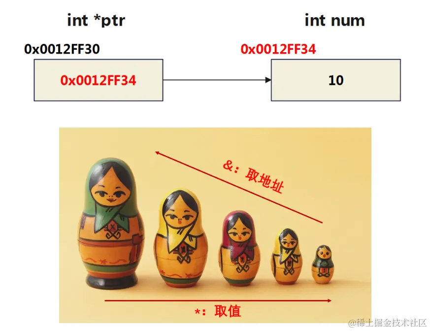 其中,“*”不同于定义指针变量的符号,这里是运算符。“指针表达式”用于得到一个内存地址,与“*”结合以获得该内存地址对应变量的值。