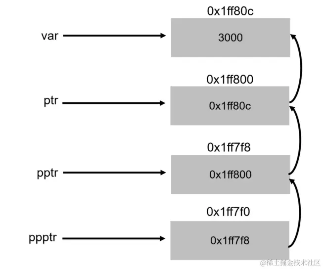 举例3:一个指针指向的可能还是指针,这时就要用两个星号 ** 表示。(后面讲)