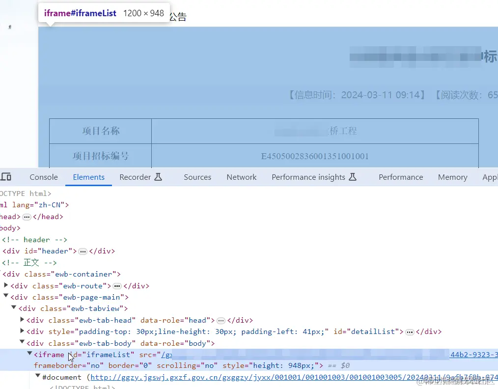 再看公示详情页,从 HTML 源码或者 DOM 结构可以看出,真正的内容是嵌套其中的。