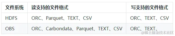 目前外表支持与普通表进行关联查询,并支持多种文件存储格式,其支持的文件格式如下(不同版本能力可能存在差异,以官方文档为准):