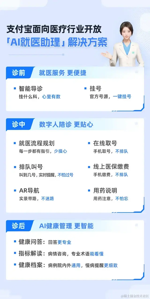 支付宝于昨日发布「AI 就医助理」解决方案,旨在利用 AI 大模型、数字人等技术,助力医疗机构为患者提供覆盖就医前、中、后的「AI 陪伴就诊」服务。
