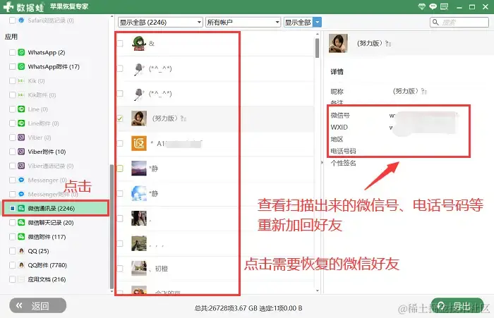 通过很多方法还是无法找回好友,微信怎么恢复好友?这时我们可以试试专业软件——数据蛙苹果恢复专家的扫描功能。该软件操作简单,只需几步,就可以快速扫描出数据。通过预览扫描结果,找到微信好友的微信号或者手机号等信息,快速加回来。