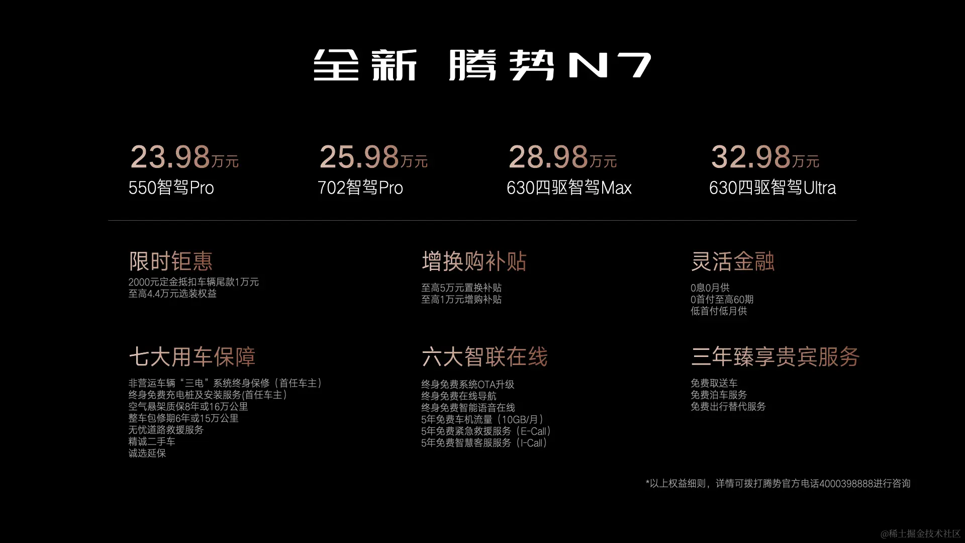 综上所述,腾势N7不仅是一款豪华智能SUV,更是一款能够引领出行新风尚的车型。它以其独特的设计、豪华的配置、出色的性能以及优惠的售价赢得广泛赞誉。相信在未来,腾势N7将成为市场上的一匹黑马,为新能源汽车行业的发展注入新的活力。