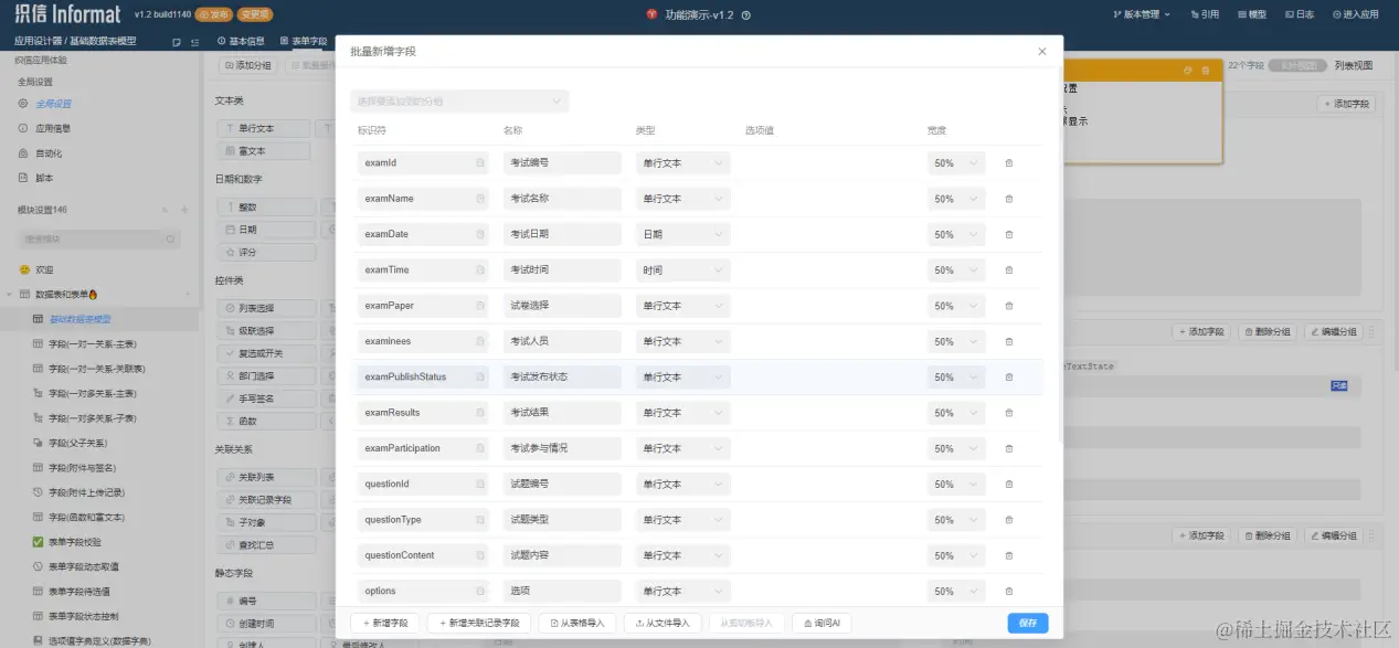 模型梳理好,就进入应用设计开发阶段了。开发人员用可视化的方式做应用设计方案,把之前梳理好的数据模型表用“批量新增字段”功能导进来,然后逐个调整数据表字段的细项属性,比如权限、动态取值、校验、显示样式等,再根据需要增添交互按钮、筛选项、数据排序方式、事件监听等功能。