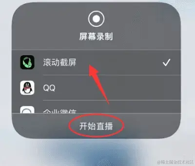 (3)找到并点击**【滚动截屏】应用,之后选择【开始直播】。滚动录制完成后,再次单击【屏幕录制】图标以暂停录制。然后直接打开【滚动截屏】**软件,保存选中的截图。