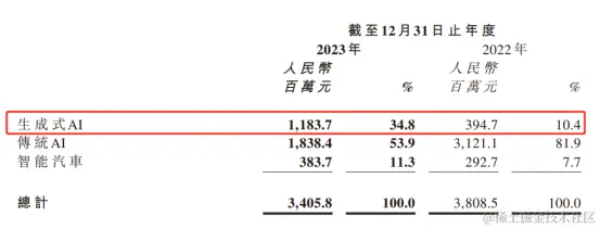 和2022年相比,2023年商汤生成式 AI 业务的收入爆发式增长200%,整体占比也从10% 增长到 35%。