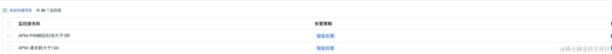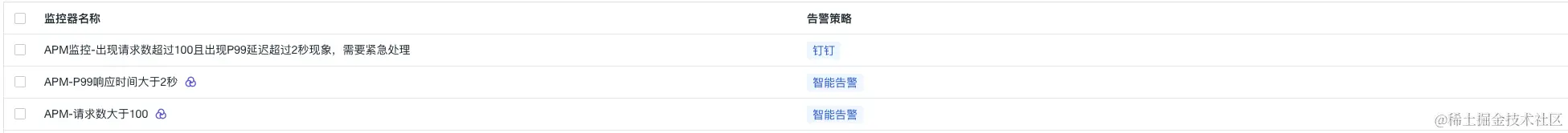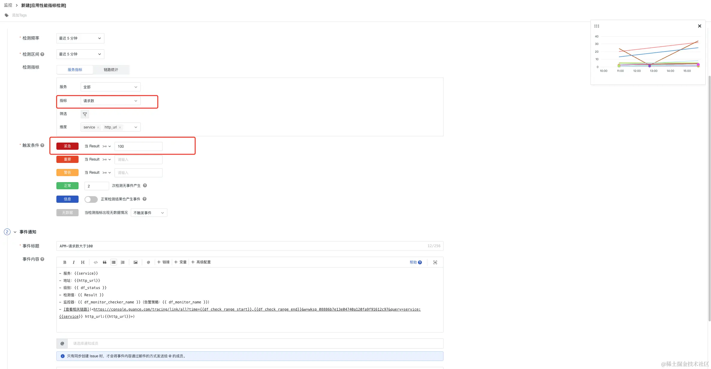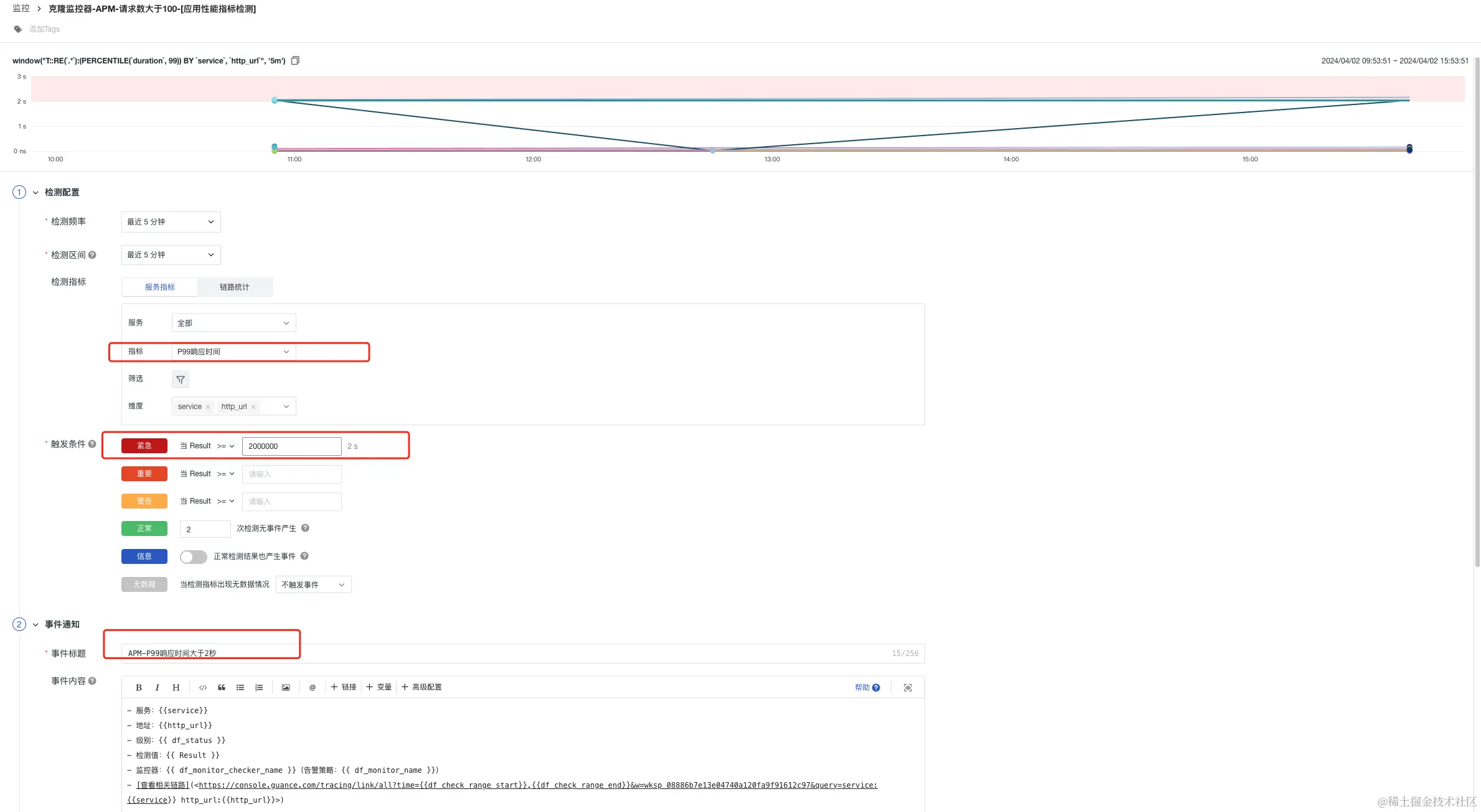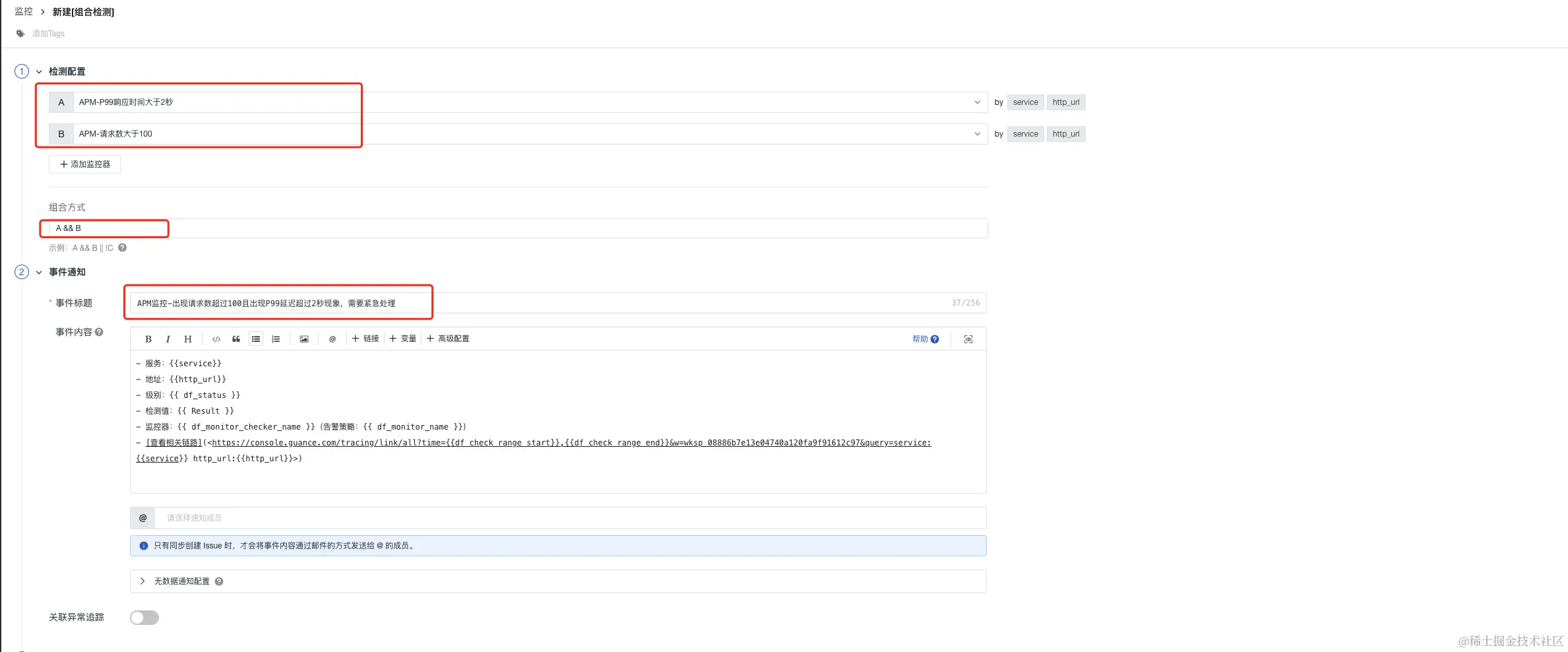 监控APM应用链路性能组合监测中,开发工程师也是需要设置一些优先级最高的告警,比如当监测链路请求的P99延迟,那么如果请求数比较少,直接配置告警,会出现误报现象,那么这个单个监控是没有价值的,所以组合监控方案中:将请求数和P99延迟进行组合,当请求量满足阈值(大于100),而且P99延迟大于设定阈值,立刻告警,通知一线开发,告警升级,紧急修复,达到精准监控的效果,设置主要分以下几步骤