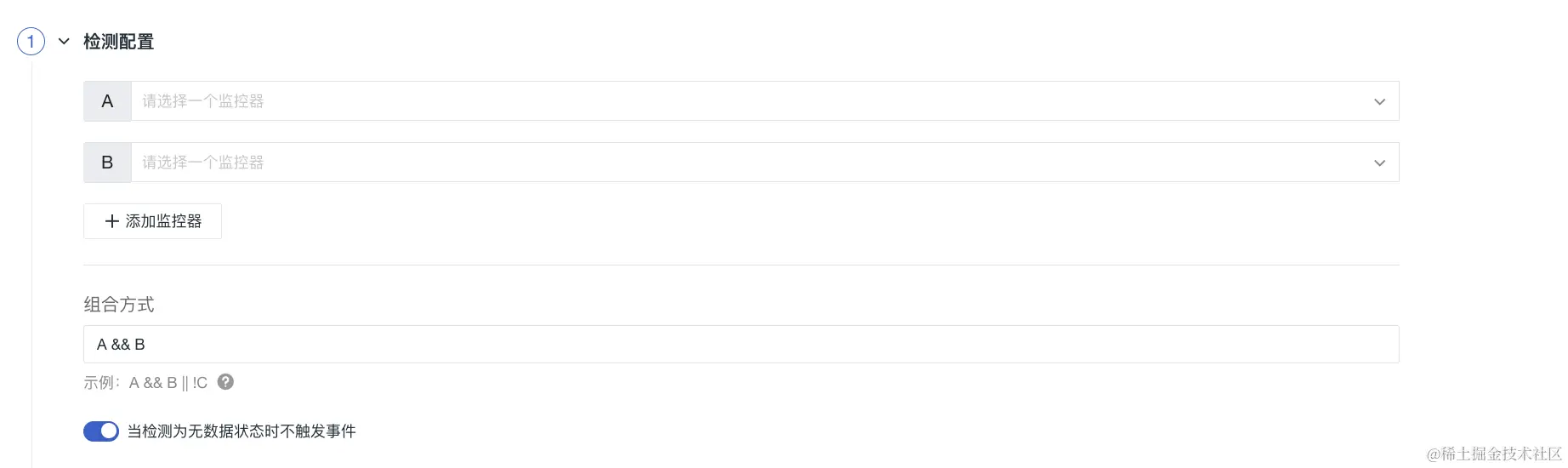 2)组合方式:遵循与或非的运算逻辑表达式来定义组合监控器是否触发事件。当所选监控器都触发异常状态时,解析为真,反之解析为假。