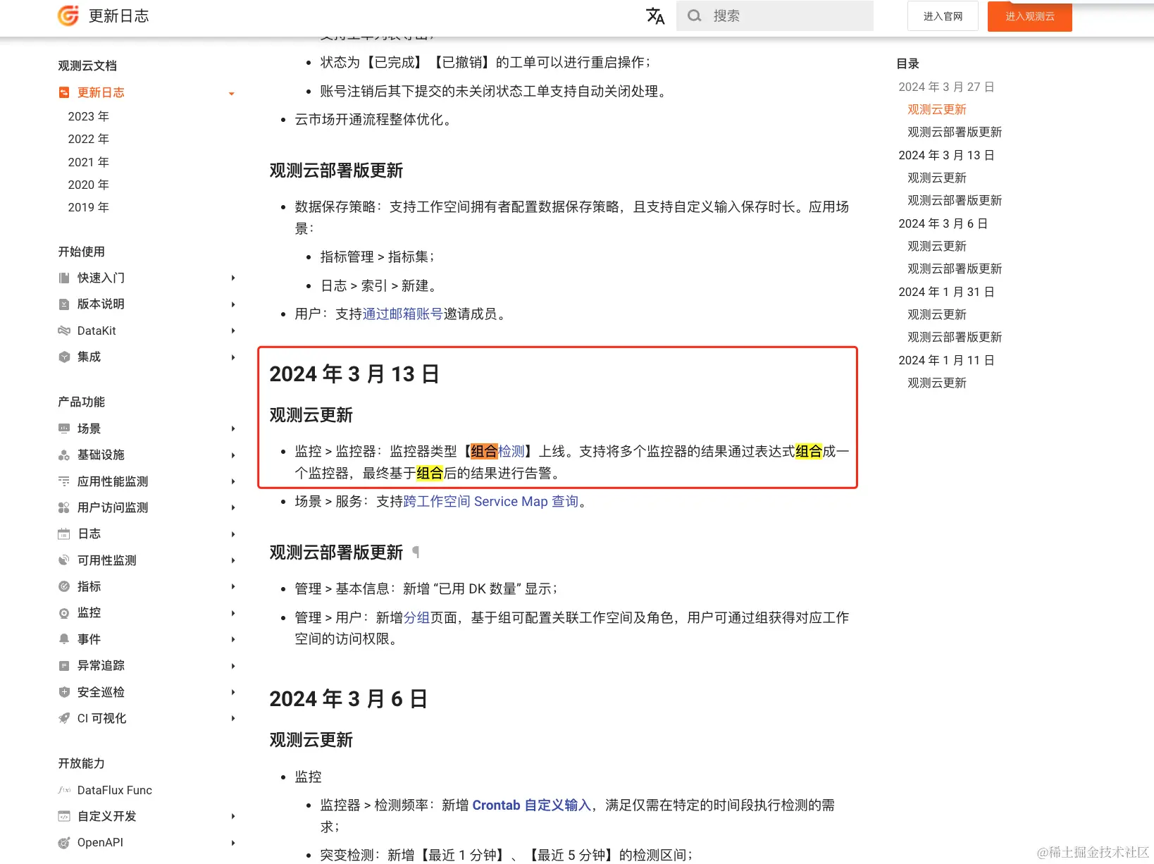 目前调研了下,能够满足组合监控场景的平台少之又少,观测云这种可观测平台算一个,观测云是一款面向开发、运维、测试及业务团队的实时数据监测平台,能够统 一满足云、云原生、应用及业务上的监测需求,快速实现基础设施、中间件、应 用层和业务层的可观测。在最近观测云的更新日志中,看到【组合监测】上线