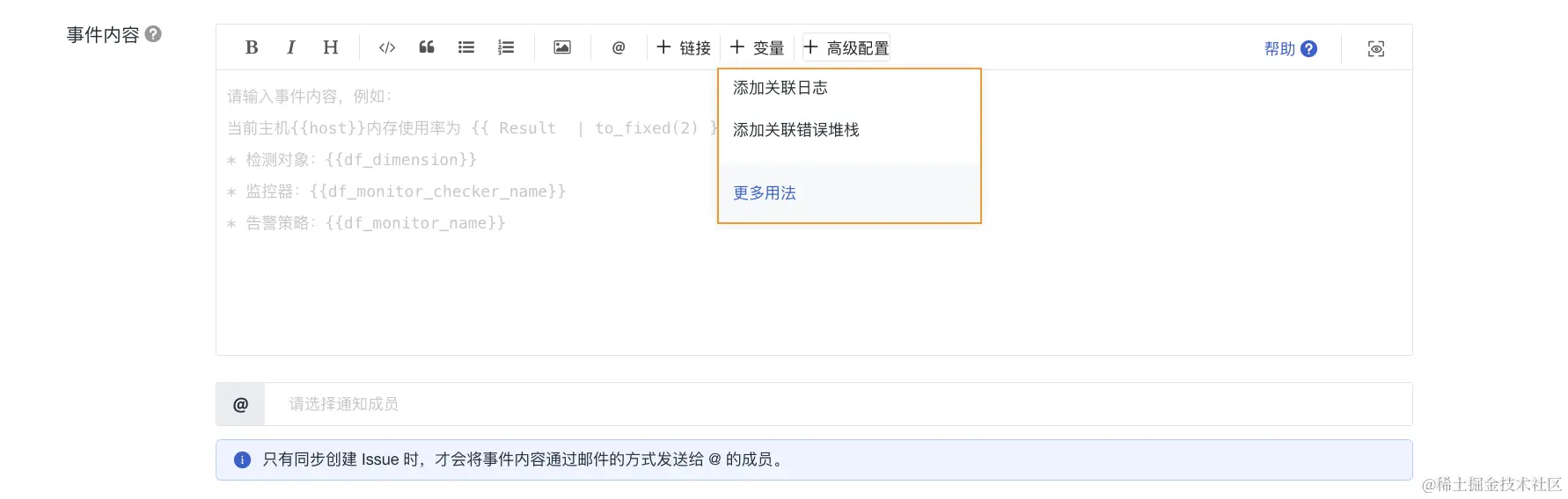2)事件内容:满足触发条件时发送的事件通知内容。支持输入 Markdown 格式文本信息并预览效果,支持使用预置的 关联链接,支持使用预置的模板变量。