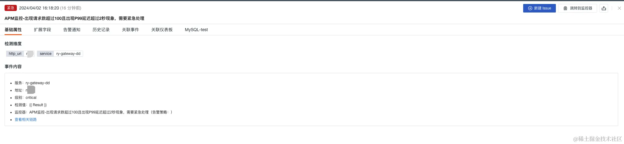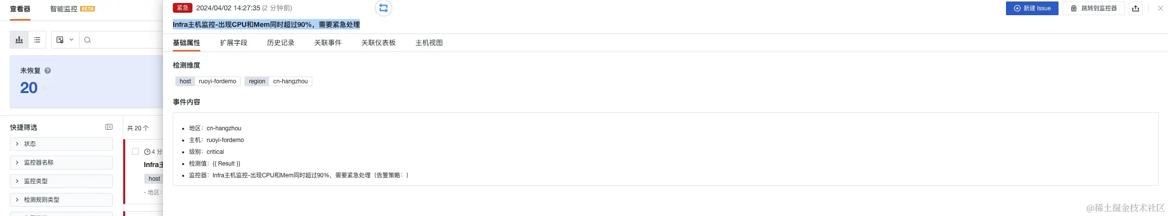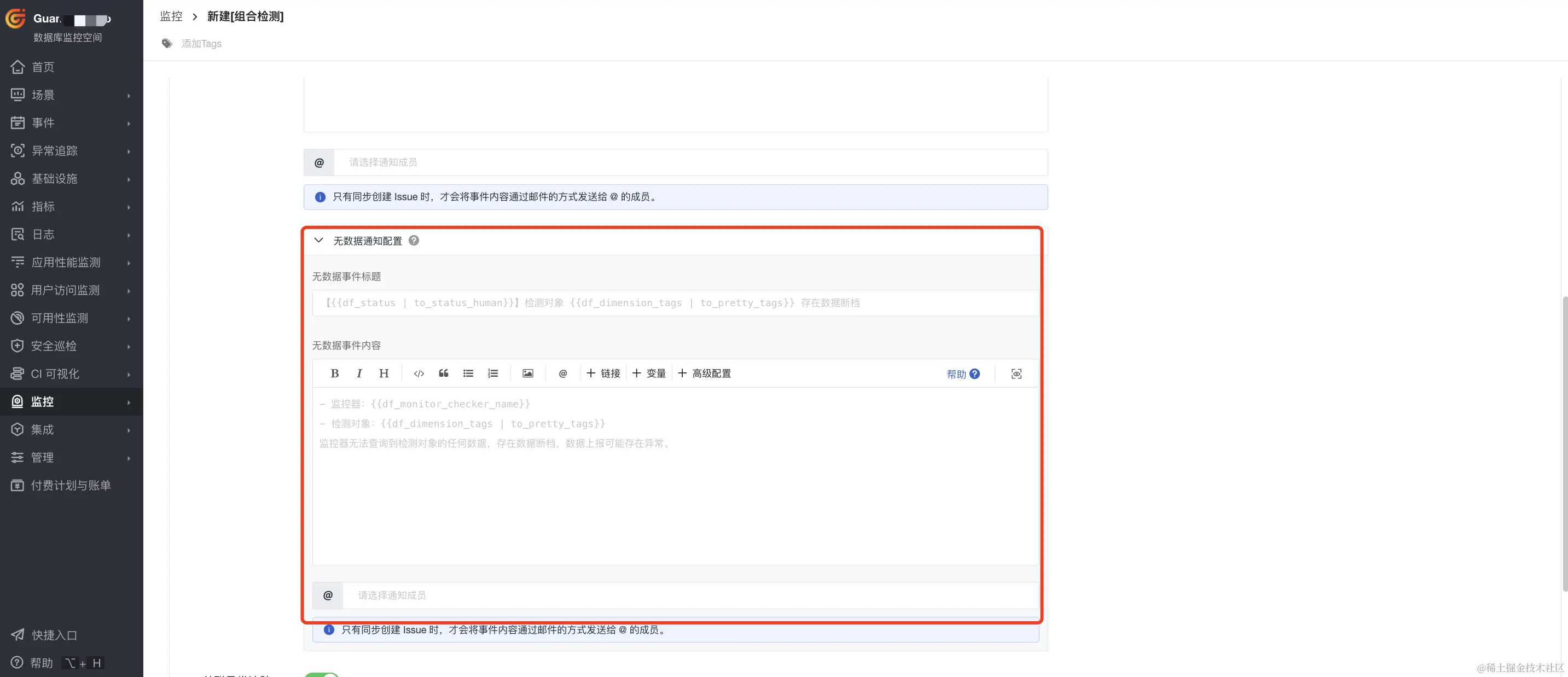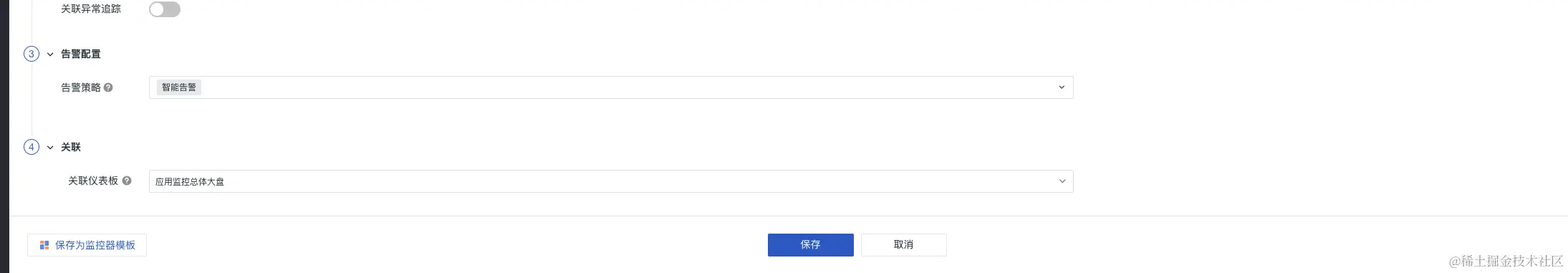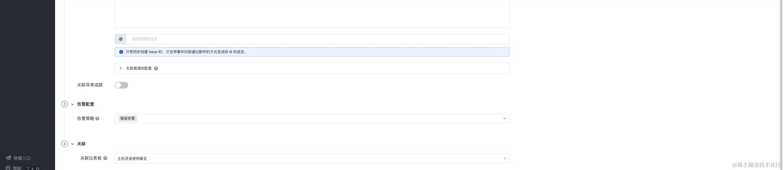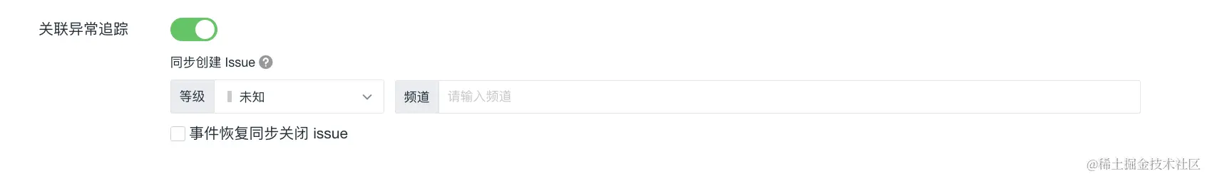 3)关联异常追踪:开启关联后,若该监控器下产生了异常事件,将同步创建 Issue。选择 Issue 的等级以及需要投递的目标频道,产生的 Issue 可以前往异常追踪 您选定的频道进行查看。