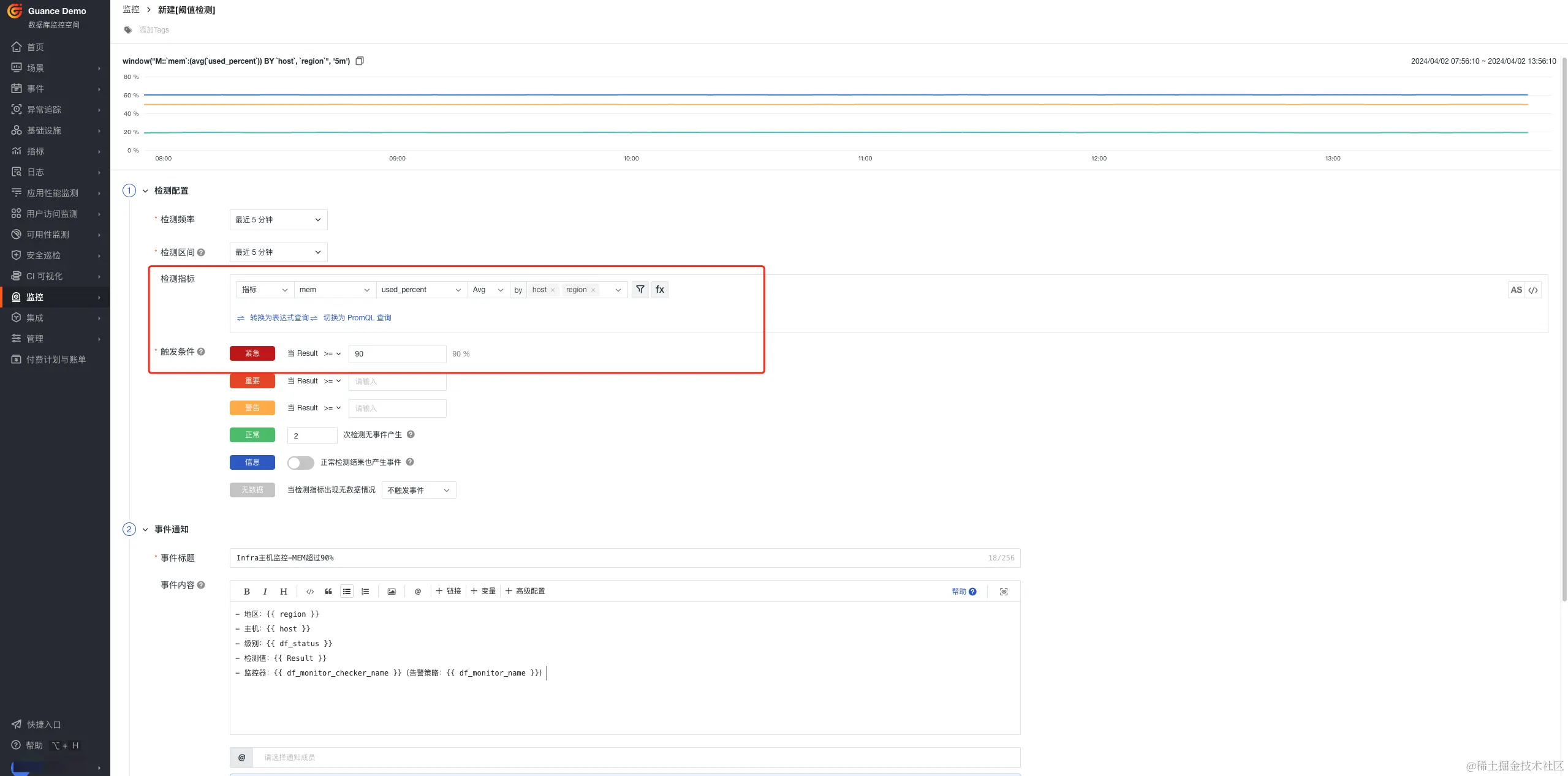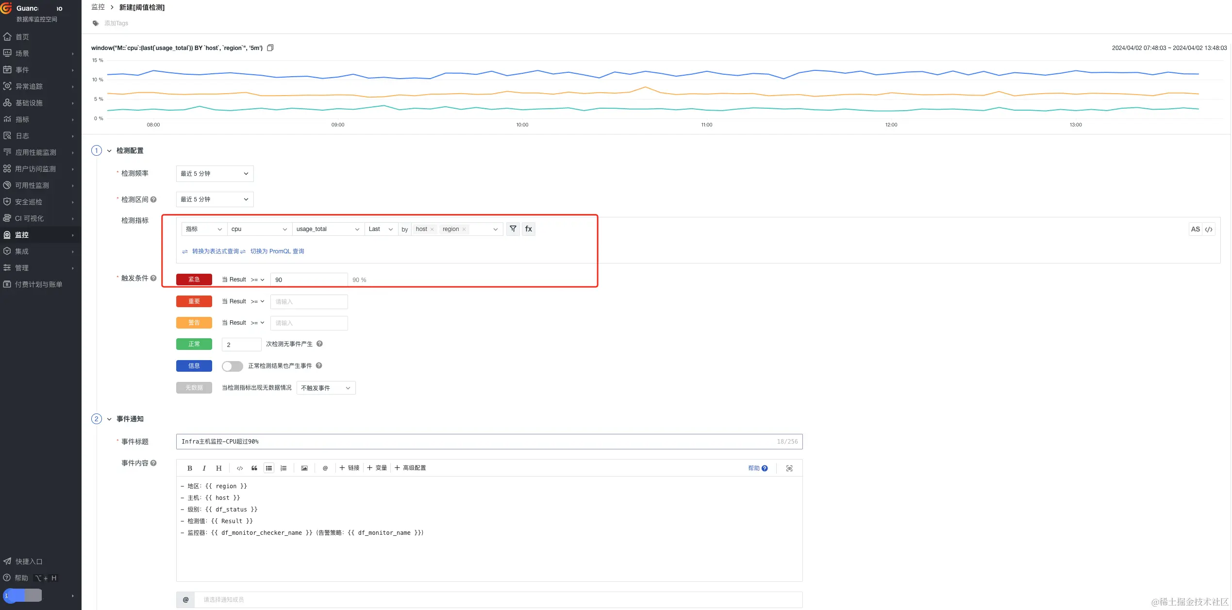 Infra基础设施层指标组合监测中,SRE工程师需要设置一些优先级最高的告警,比如当CPU、MEM同时满足90%,紧急通知一线人员,设置主要分以下几步骤