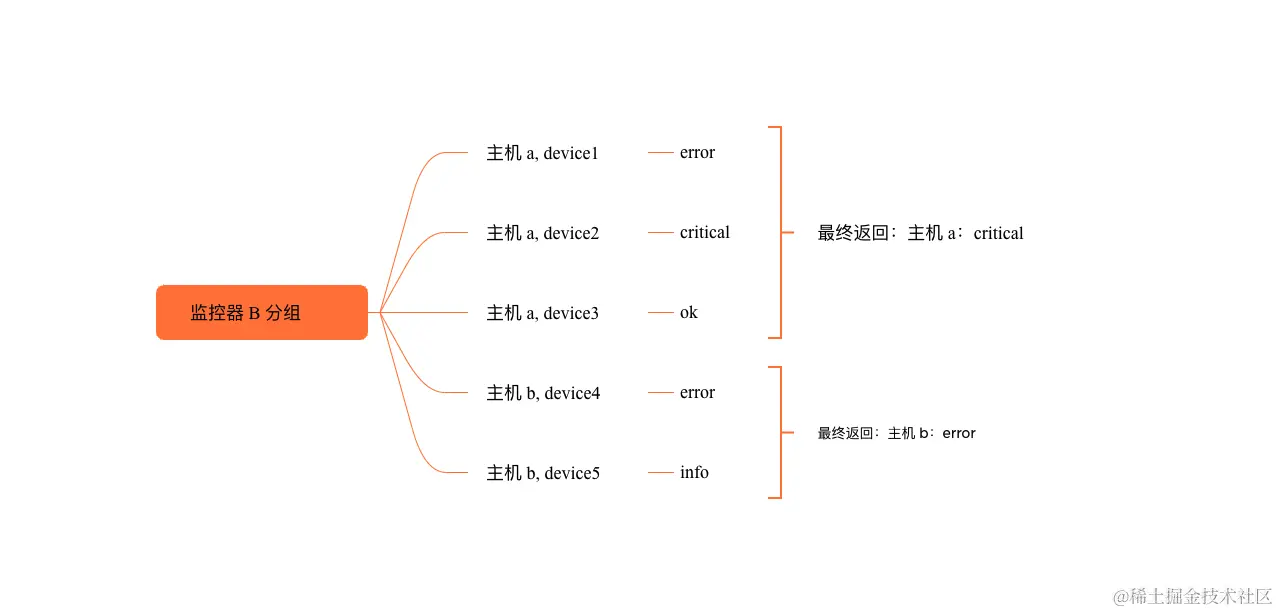 选择监控器 A:by host;监控器 B:by host, device,此时取交集 host 作为最终的 dimension_tags,监控器 A 正常判断即可,监控器 B 中取主机的所有 device 的最严重等级作为其状态,例如: