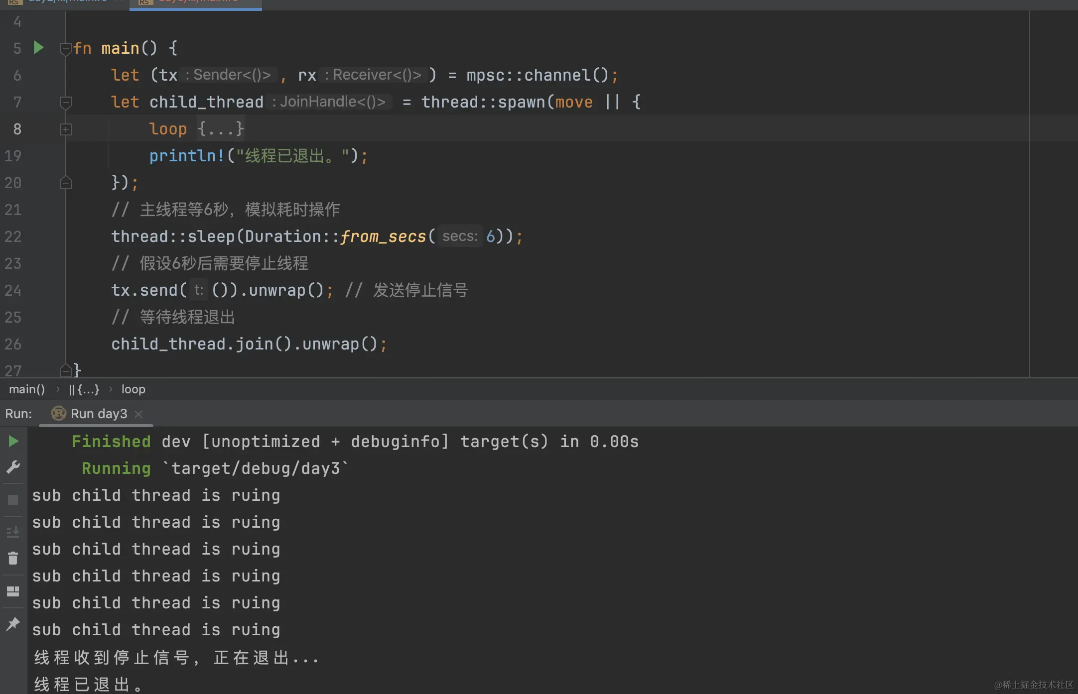 recv:方法是阻塞的,即 它会阻塞当前线程, 直到从通道中接收到消息。 线程在调用rx.recv().unwrap()时会阻塞 等待消息的到来。一旦主线程通过tx.send(msg).unwrap();发送了消息,主线程会接收到这个消息并继续执行,之后程序才会正常退出。
