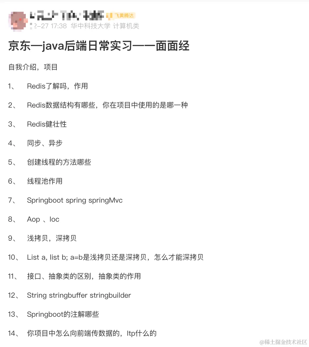 今天分享的是一位华中科技大学同学分享的京东一面面经,主要是一些非常基础的问题,也就是比较简单且容易准备的常规八股。