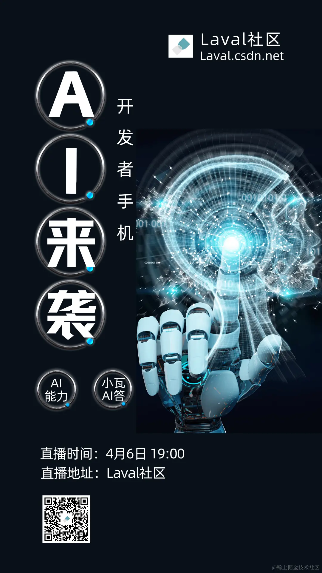 开发者手机 AI 来袭 LAVAL社区小助手 2024-04-03 44 阅读1分钟 直播时间:4 月 6 日 19:00 开发者手机 AI 来袭,请来 Laval 社区看直播 AI 能力 + 小瓦爱答