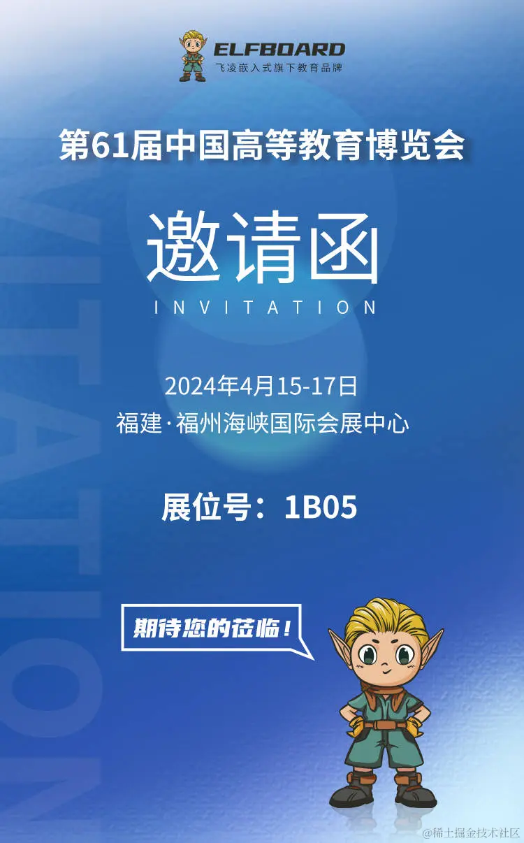 2024年4月15日-17日,第61届中国高等教育博览会(简称“高博会”)将在福州海峡国际会展中心举行, 飞凌嵌入式旗下教育品牌ElfBoard将隆重参会,这也是品牌成立以来的展会首秀。