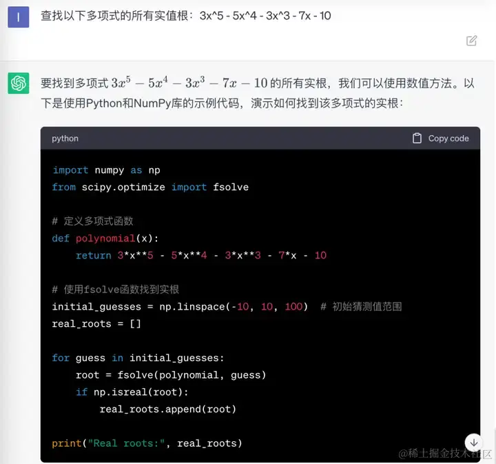 - 提示词:查找以下多项式的所有实值根:3x^5 - 5x^4 - 3x^3 - 7x - 10 ,使用Python 实现。