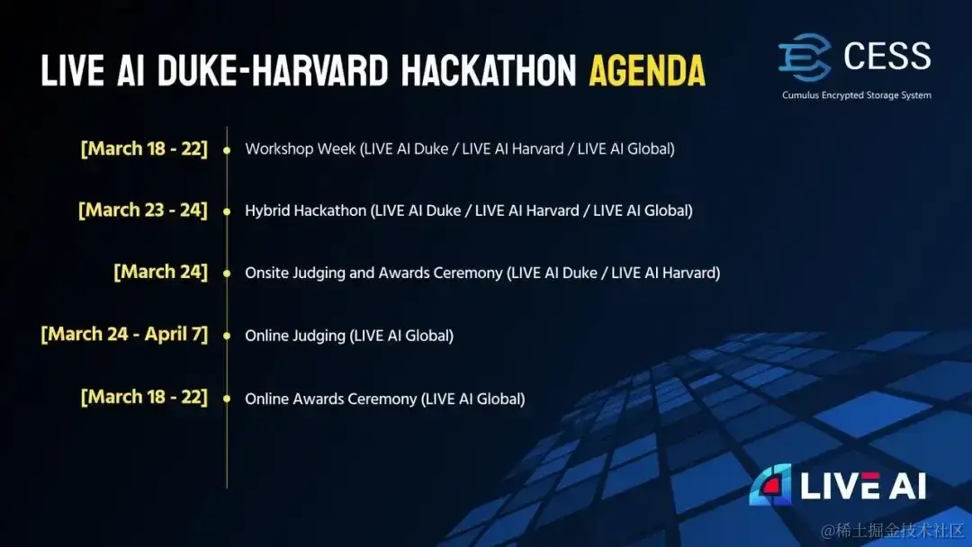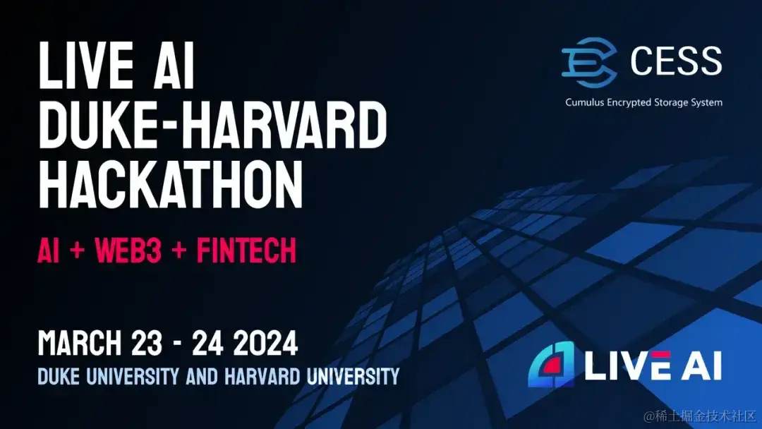 LIVE AI 1 Joint Duke-Harvard Hackathon 是一场跨校园的混合黑客松,旨在邀请来自不同背景的开发者、设计师和创意人士共同参与,设计和开发以人工智能、区块链/Web3、Fintech 类型中的创新项目。CESS 作为 Cohost 之一,携手杜克大学、哈佛大学一起推动赛事进行,同时得到了来自 MIT、Brown、Princeton、Columbia 等多所常春藤高校的支持,吸引了全球顶尖学府的人才参加。