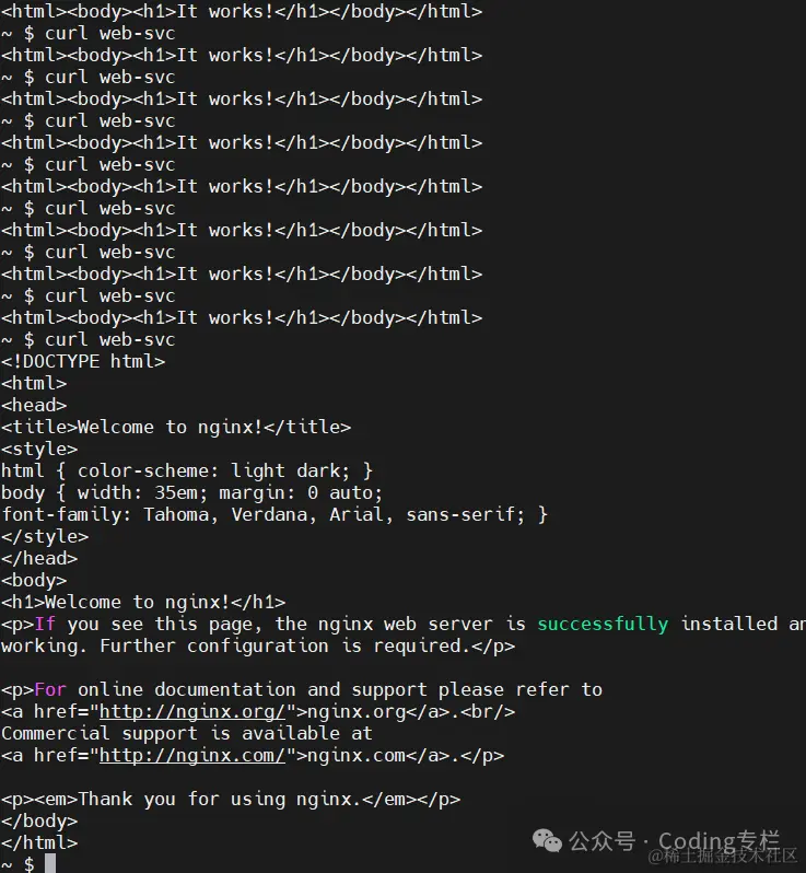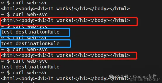 可以看到流量通过子集的权重进行了划分,多次访问后,nginx:httpd的流量比基本是1:9
