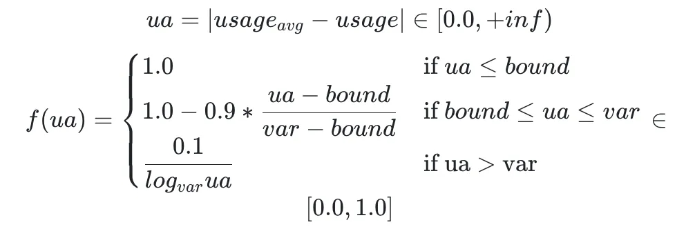 ua 值越大,表示与期望值偏离越大,得分也即越低,当偏离值在均值范围内时,得分不变,表示在此范围内的分区移动对此目标无影响。当偏离值大于均值范围,但小于 var 值时,得分随着偏移量线性下降,当偏离值大于 var 值时,随着偏移量趋于无穷大,得分趋于零。函数曲线如下(为易读性坐标轴做了相应伸缩):