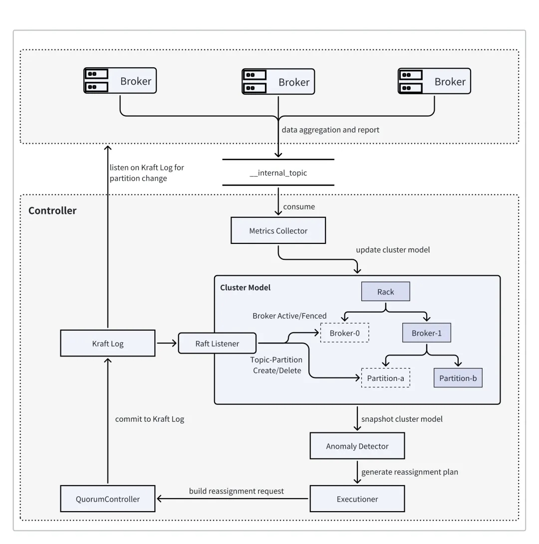 除了 Broker 侧完成指标采集外,状态感知和决策调度由 Active Controller 处理,确保调度组件的可用性与 Controller KRaft Group 保持一致。