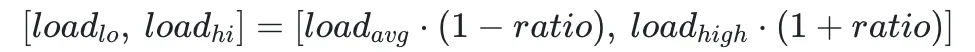 以流量均衡目标为例,首先根据集群总体流量和 Broker 数量,计算出流量平均值 loadavg ,再根据预设的偏移系数 ratio(可接受的流量与均值的偏差范围),计算出期望的流量分布范围: