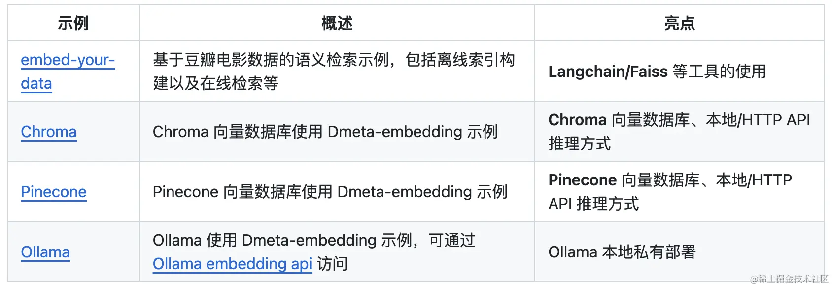 为此我们也围绕 Embedding 在大模型中的几个经典使用场景准备了教程和示例,后续还会不断进行补充完善: