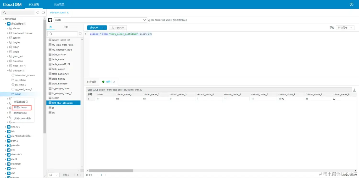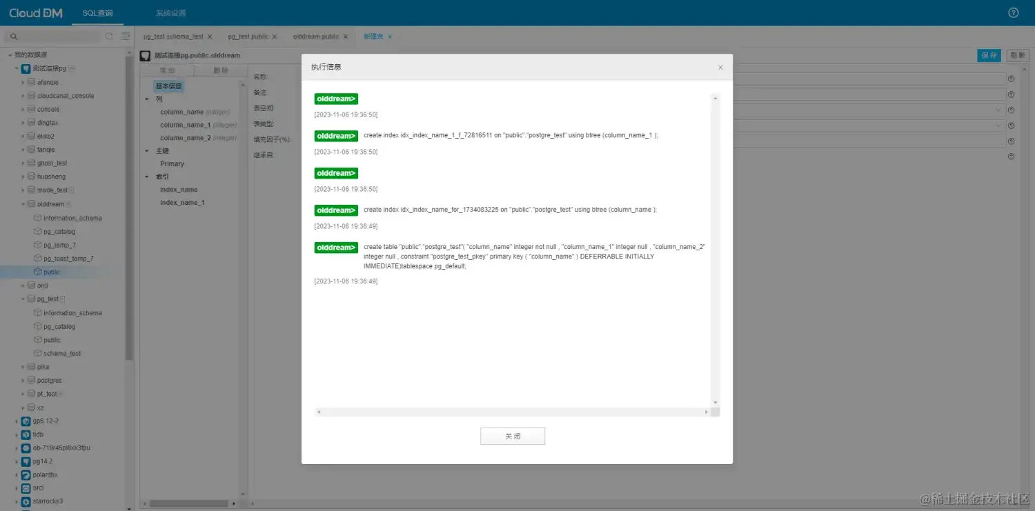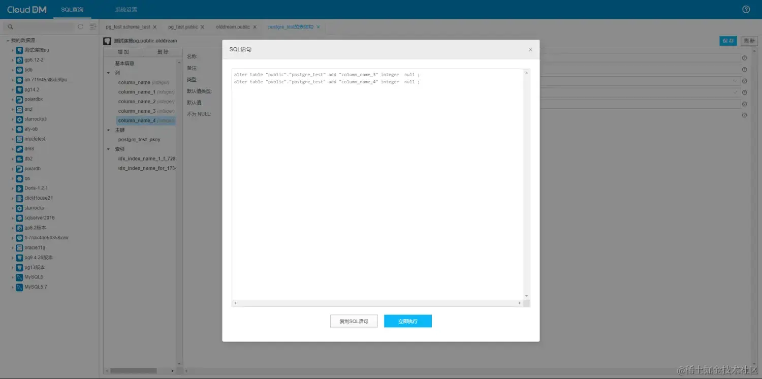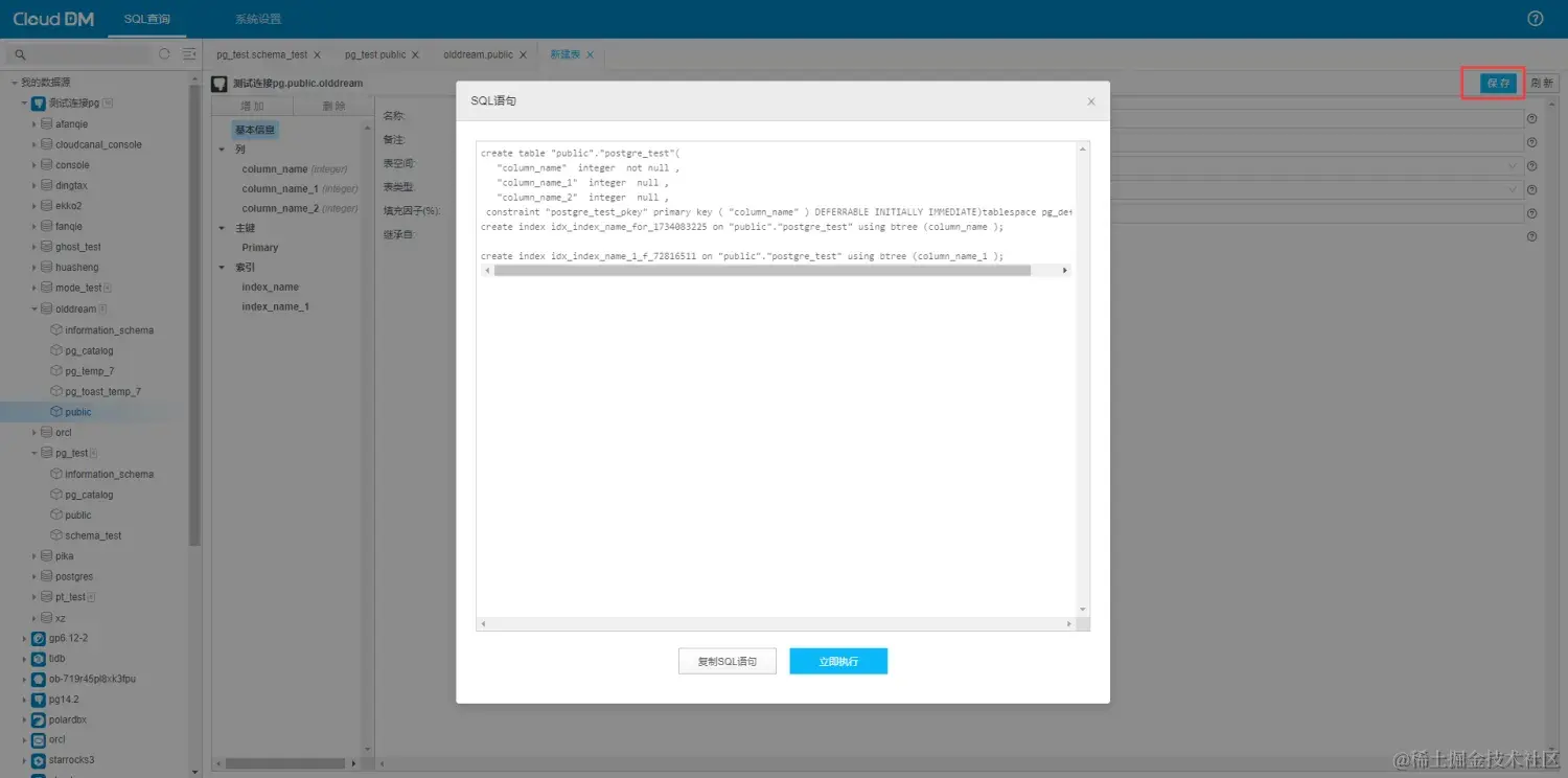 目前,CloudDM 对数据库表的管理比较的齐全,包括创建表,删除表,修改表,清空表同时对 postgreSQL 的 DDL 支持比较齐全,可以应对大量的场景。